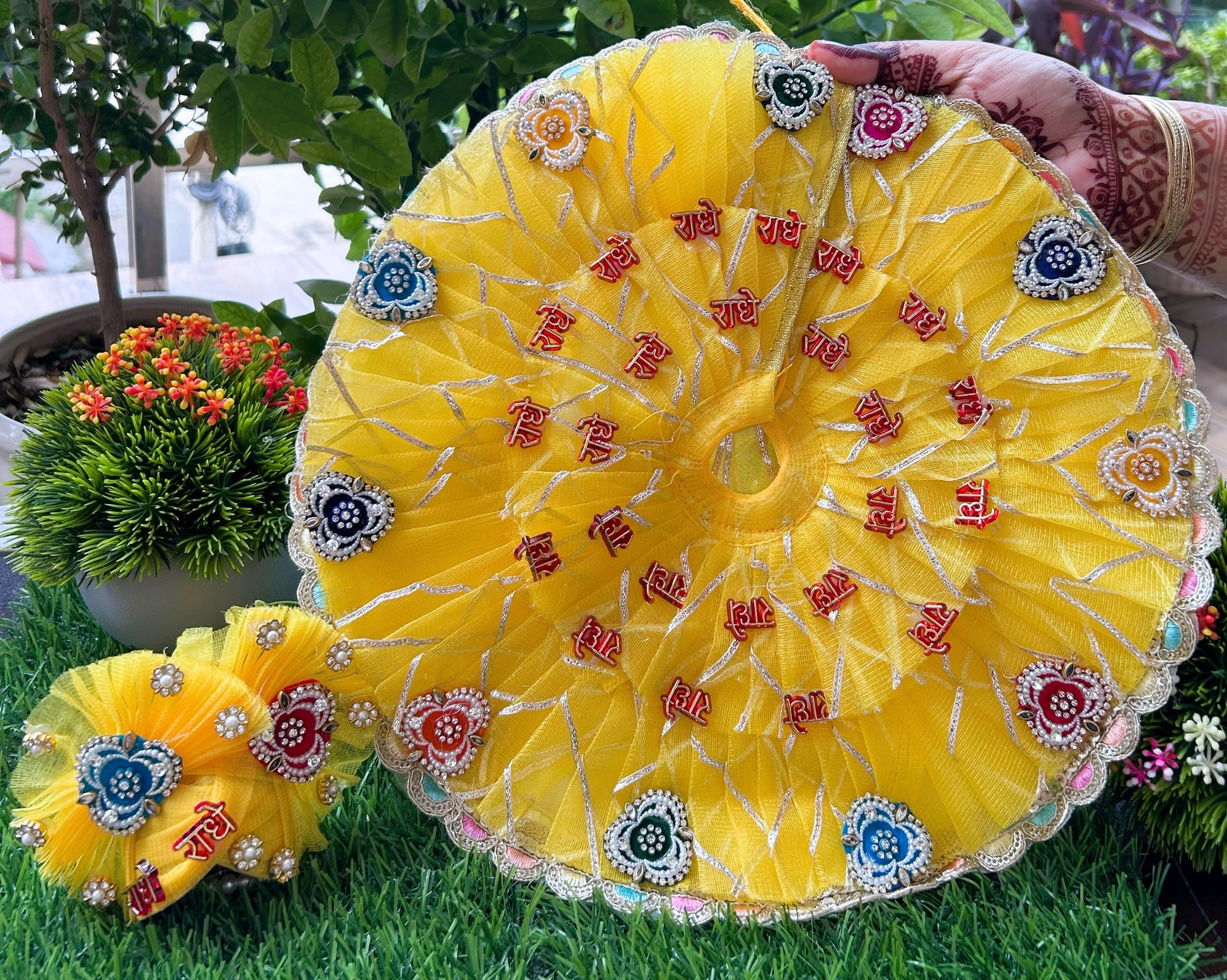 A bright yellow dress beautifully printed with “Radhe Radhe,” radiating divine love and devotion. Adorned with soft fabric and subtle sparkle, it reflects the pure bond of Radha and Krishna. Perfect for daily darshan and festivals, this shringar fills your Laddu Gopal with joy and brightness.