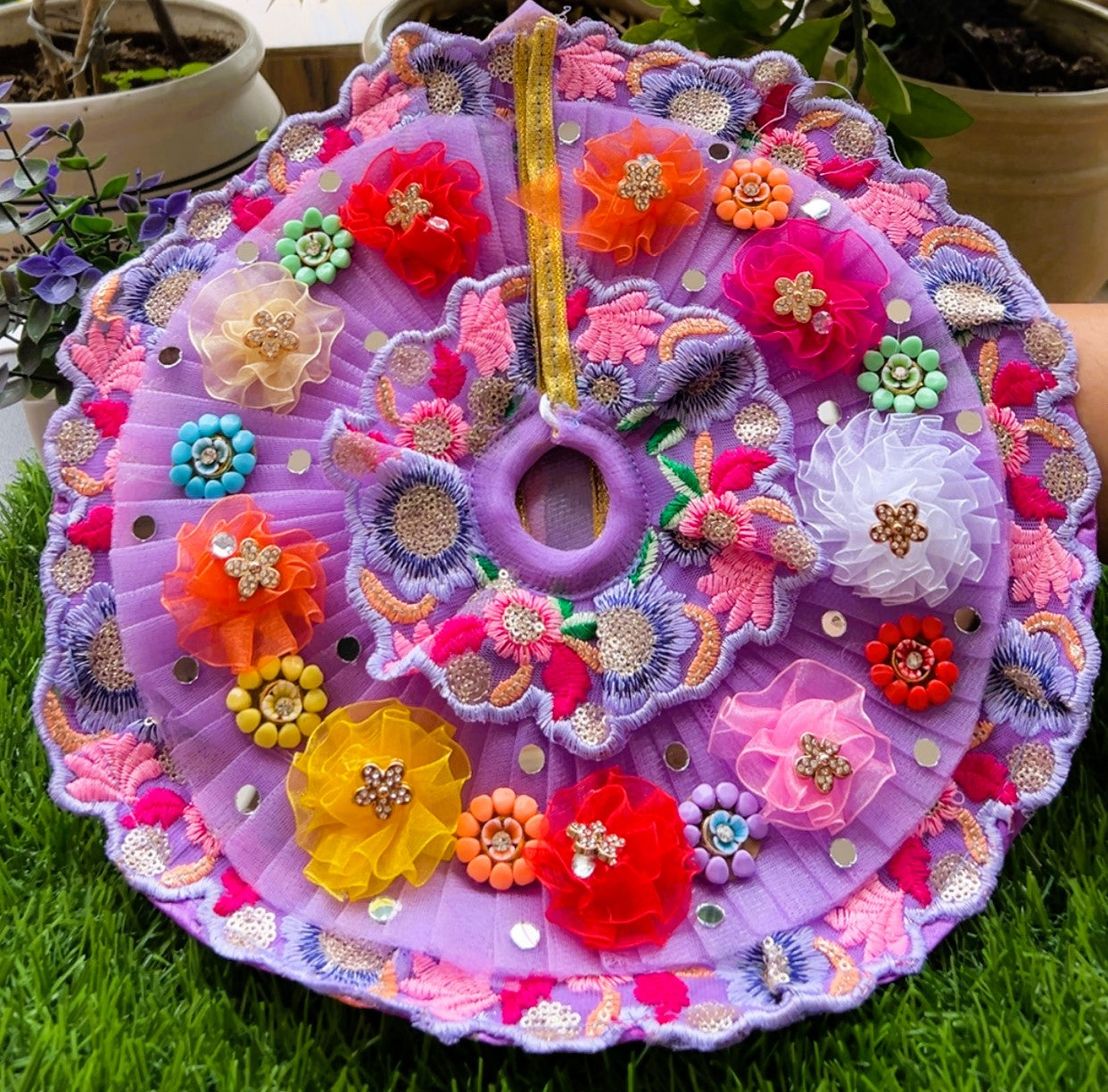 A soothing purple floral dress, crafted with soft fabric and gentle charm for your beloved Laddu Gopal. Decorated with delicate flowers and subtle sparkle, it reflects divine peace and elegance. Ideal for daily puja and festive days, this poshak adds a touch of spiritual beauty to your deity.