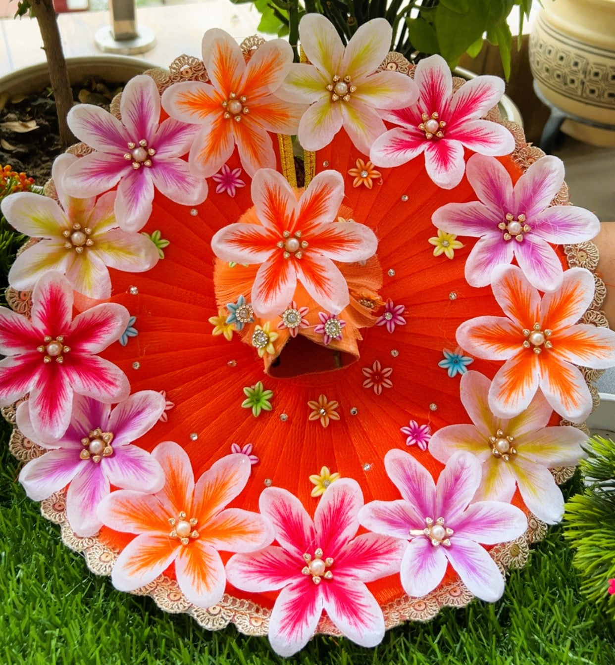 A vibrant saffron-orange dress adorned with delicate floral designs, inspired by the divine beauty of a blooming lotus. This poshak reflects purity, devotion, and Kanha Ji’s radiant charm. Perfect for festive occasions, it brings a soft, graceful glow to your Laddu Gopal.