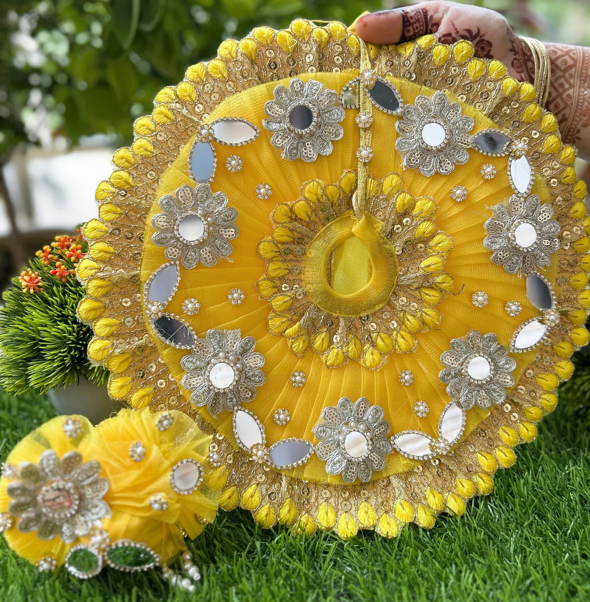 A radiant yellow dress shimmering with stone and sparkle, symbolizing the divine glow of Laddu Gopal. Crafted with care, its golden charm and intricate detailing make it truly majestic. Perfect for Janmashtami and festive rituals, this shringar brings divine light to your Laddu Gopal.