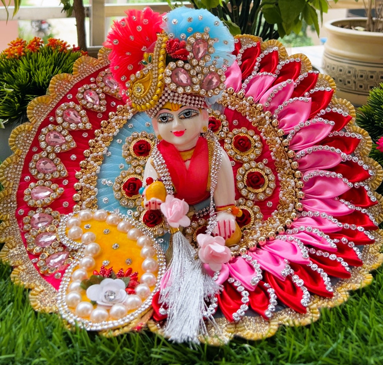 The divine accessories combo (mukut, mala and bansuri) is perfect. My Laddu Gopal looks complete now.