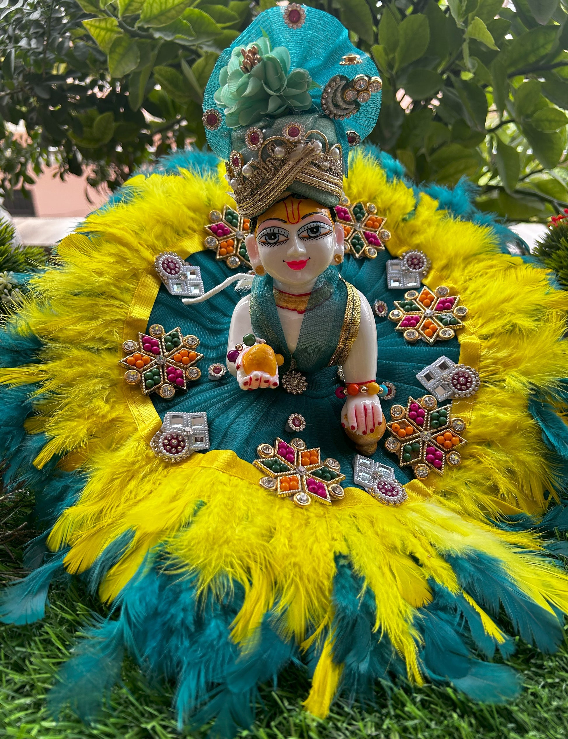 Wrap your Laddu Gopal in celestial charm with our Yellow Green Feather Divine Poshak Set. Adorned with soft yellow hues and delicate feather accents, this dress symbolizes joy, purity, and divinity. Perfect for festive occasions or daily worship, this poshak brings a radiant glow to your beloved Kanha’s darshan.