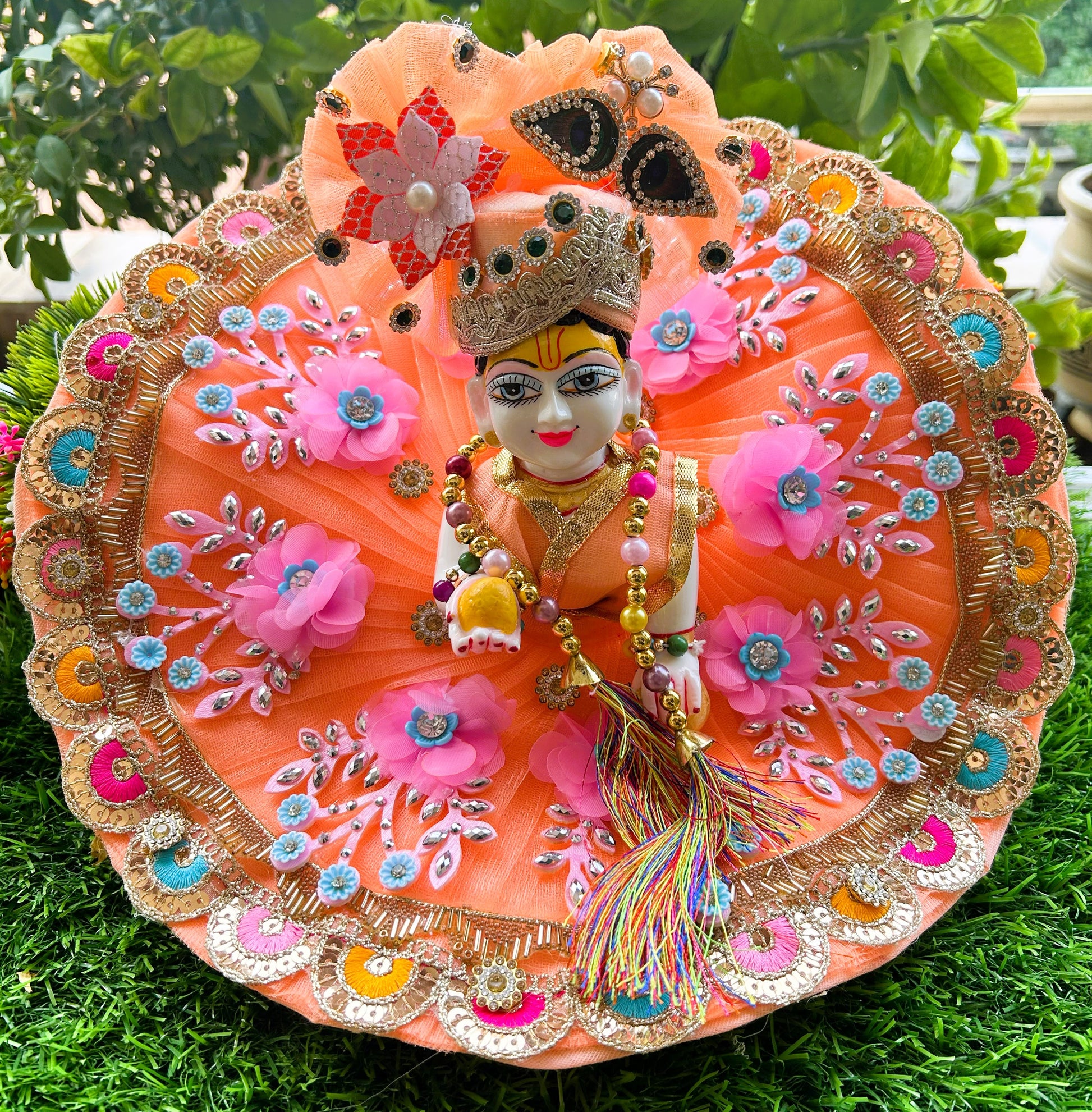 Wrap your beloved Kanha Ji in the soft elegance of this Shimmering Peach Blossom Poshak. Designed with delicate floral accents, sequin highlights, and a glowing peach hue, this outfit reflects pure devotion and festive charm. The shimmering details and handcrafted design make it a perfect pick for Janmashtami, pooja rituals, or daily shringar.