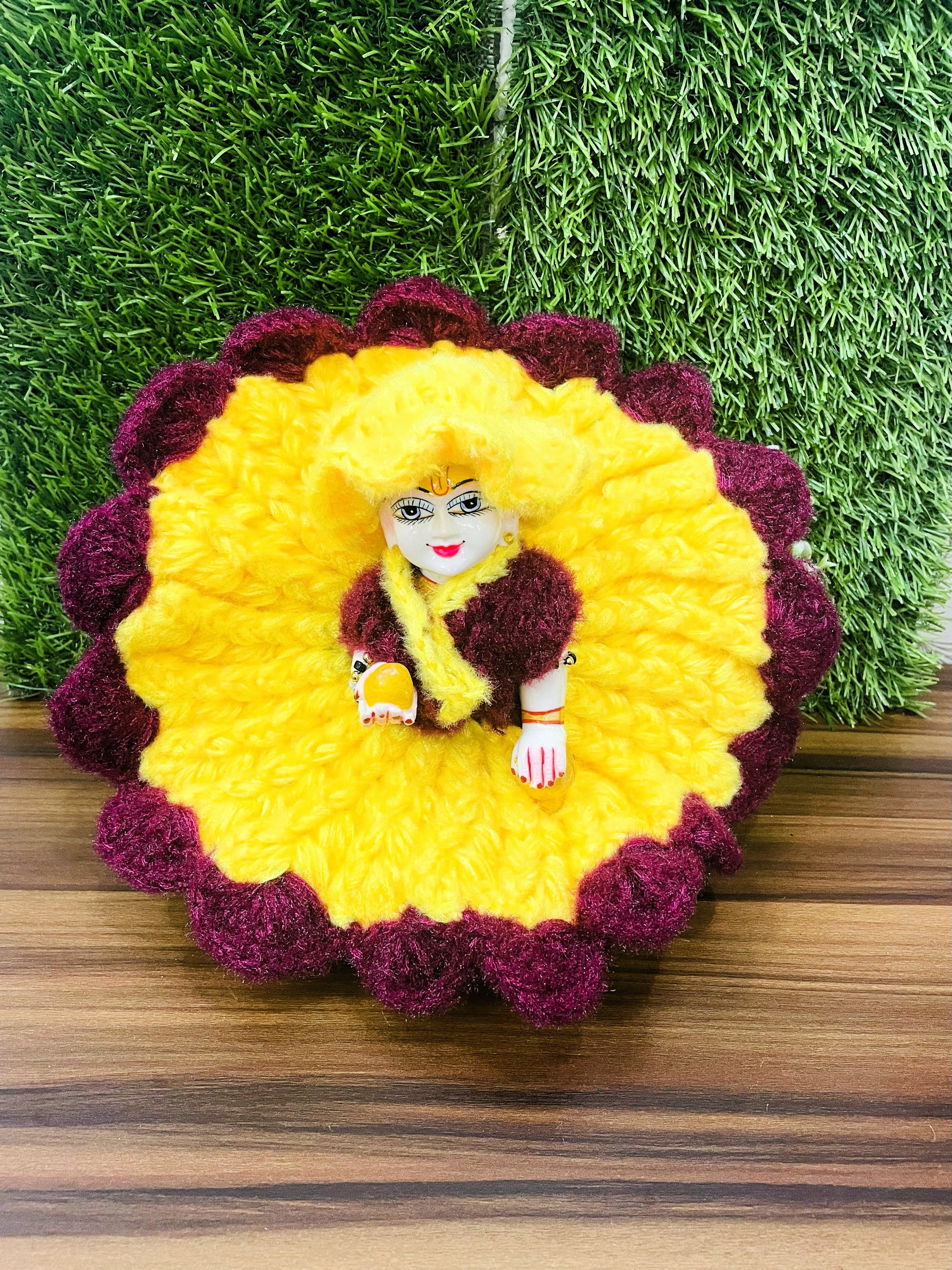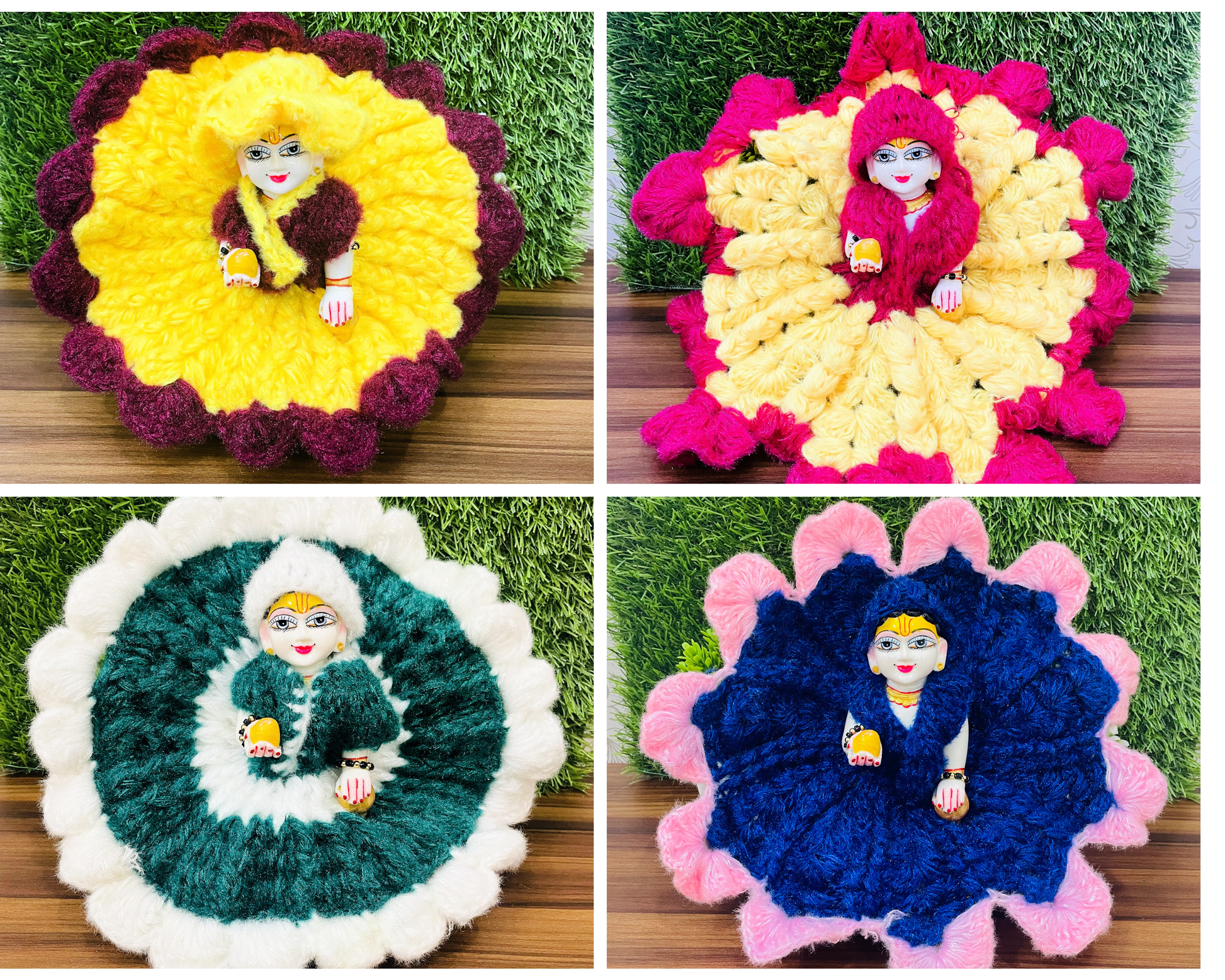 Keep your Laddu Gopal warm and stylish this winter with this beautiful combo set of 4 soft woollen dresses. Each dress is crafted with cozy, high-quality wool and decorated with delicate lace and bead detailing, giving a cute and divine look.Β